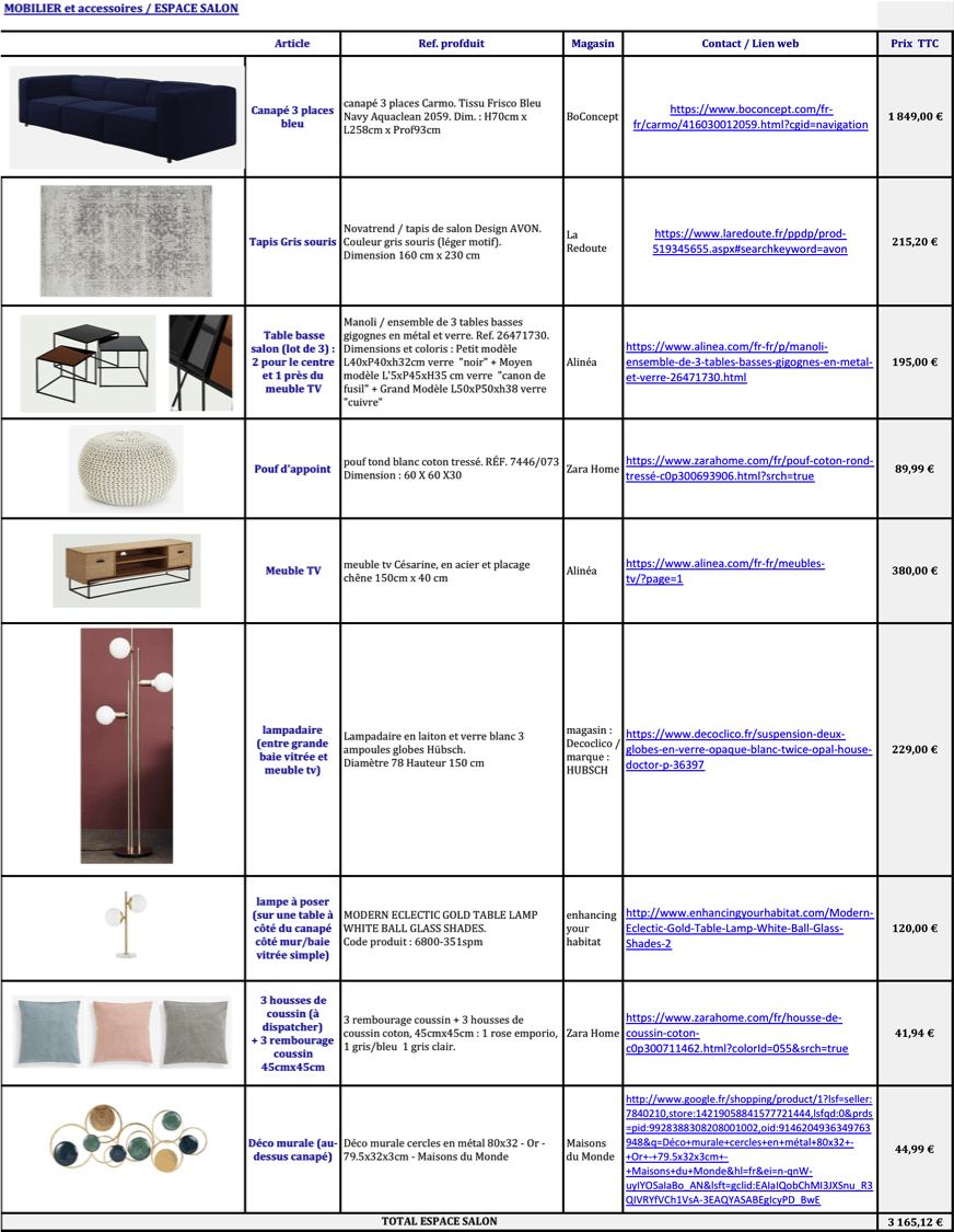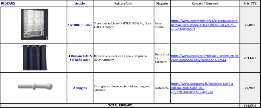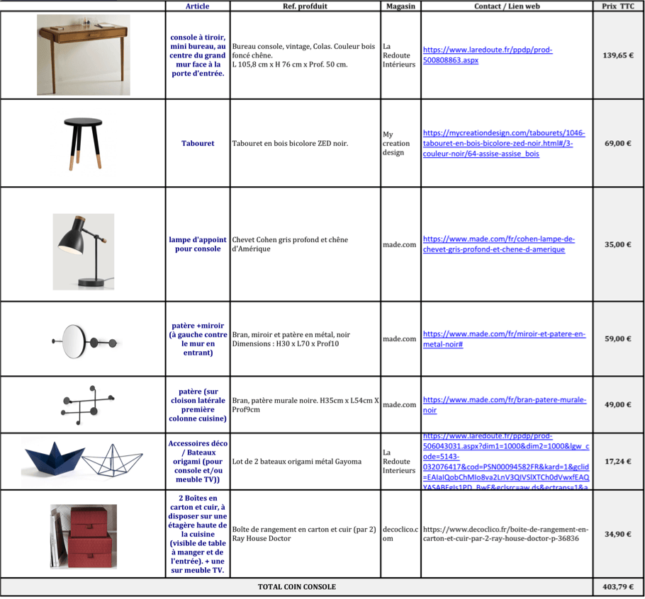 La shopping list est un tableau récapitulatif présentant les meubles, objets de décoration, accessoires pré-sélectionnés pour vous afin de compléter vos propres meubles et mettre en oeuvre votre projet